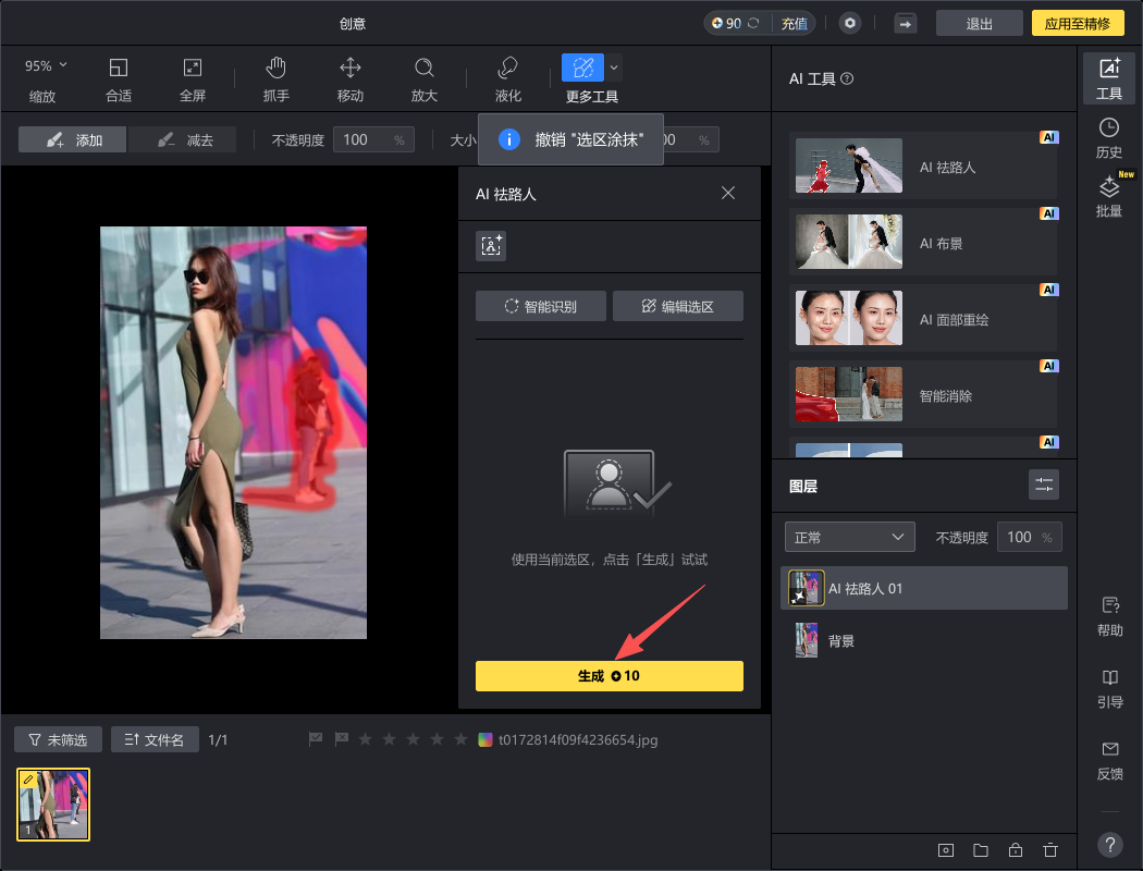 6、随后会自动涂抹路人区域,如果不满意,可以多次重复操作,重复涂抹,或者为追求精细,可以直接上手微修涂抹也是可行的,随后点击屏幕下方的“生成”。