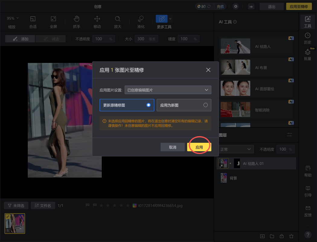 8、选择“更新原精修图”,会覆盖原图,点击“应用为新图”则会另存,点击窗口右下角的“应用”即可。