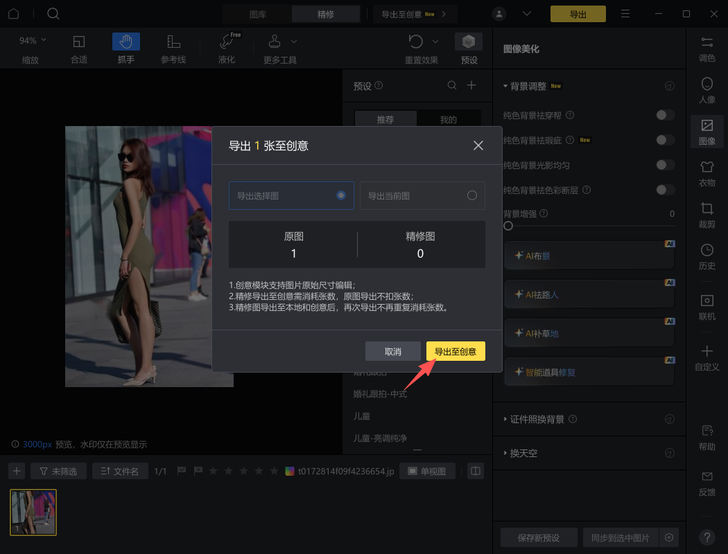 6、最后点击屏幕右上角的的“导出至精修”即可。