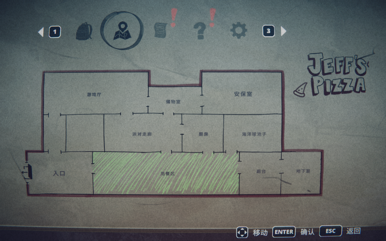 4、点击“M”键可以快捷打开地图,涂绿区域为自己所在地,可以看到任务目的地就在用餐区的右上角处。