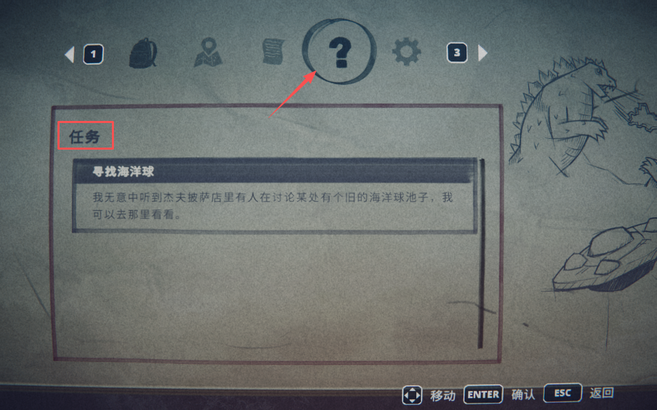 3、点击“Esc”键可以打开菜单界面,再点击“问号”标识,就可以查看当前任务了,可以看到需要前往海洋球池子。