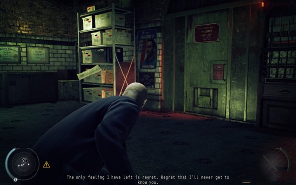 9、开取公认本场景最难的一扇门,进门后不要马上得意忘形去开关底的门。先在如图的位置机动。刚才砸书被引开的首位现在该回来路过通道了。注意在合适的距离左右晃一下让他的目光还没升满就走过去了。好了,现在打开了法庭和监狱之间的分隔门。恭喜,最难的地方已经过去。