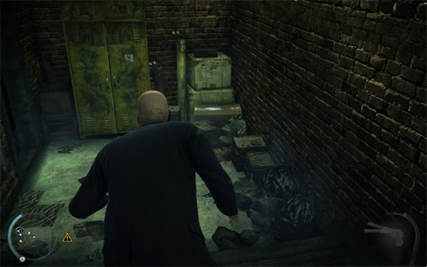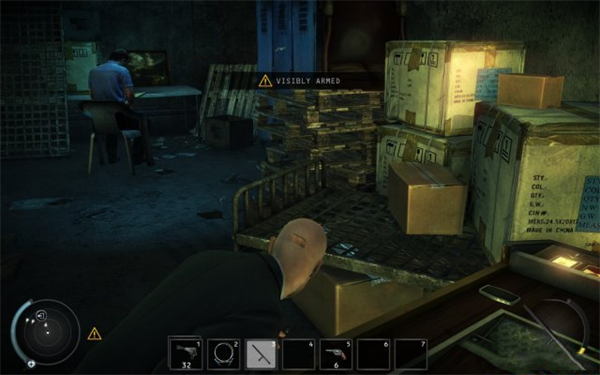 在前台偷一个花瓶。在这里先用本能侦查保安室内的人,等一个背靠墙的首位移动到面壁的位置即可行动,此时刚好室内所有人都在面壁。
