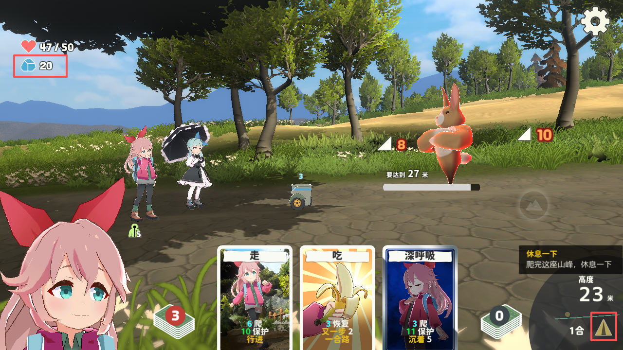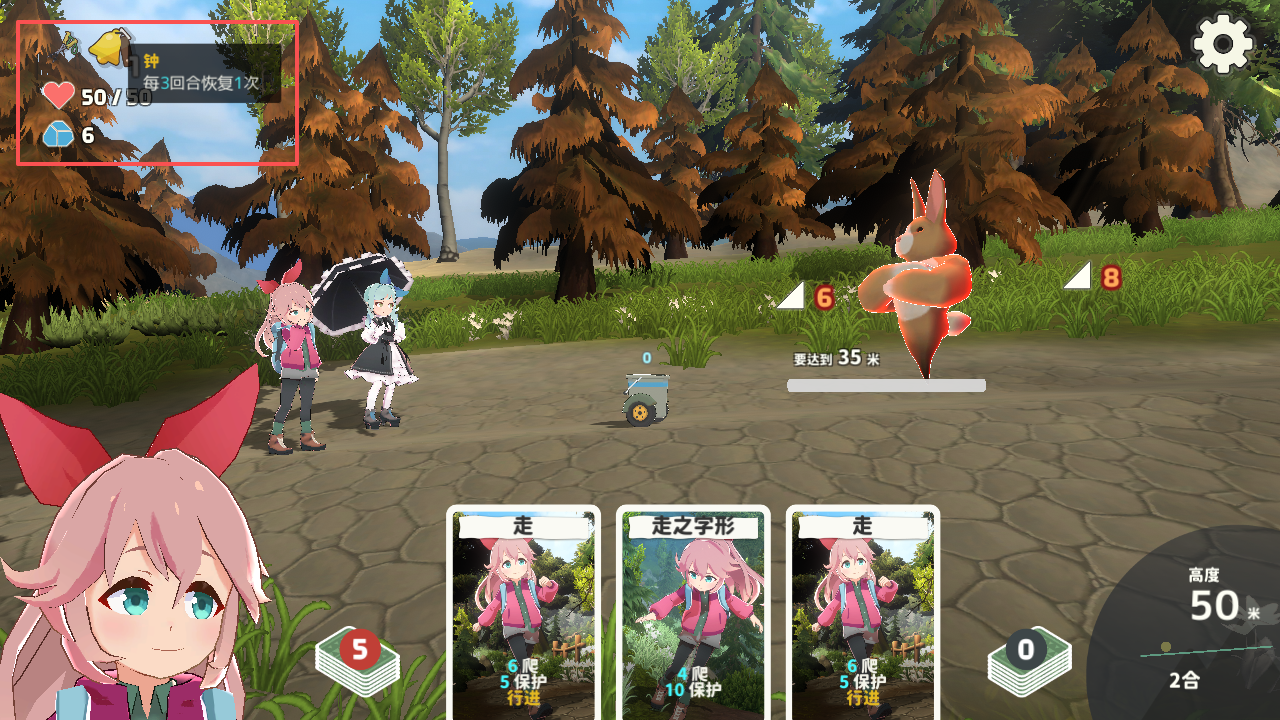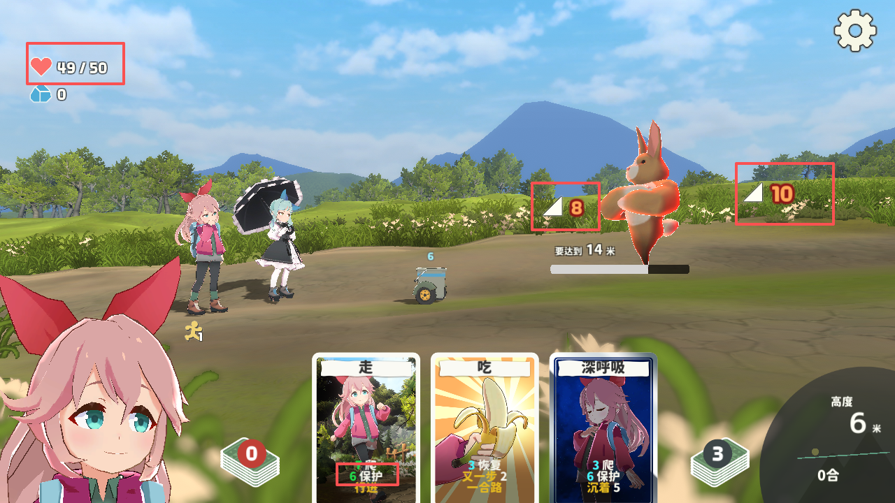 2、需要注意的是,屏幕左上方为玩家的朝气,当朝气为零则登顶失败,敌人的攻击方式为坡的陡峭程度,如这个为何为8,下个为何为10,卡牌相应的也有“爬”和“保护”,保护可以与陡峭程度相抵消,进而避免极少自己的朝气。