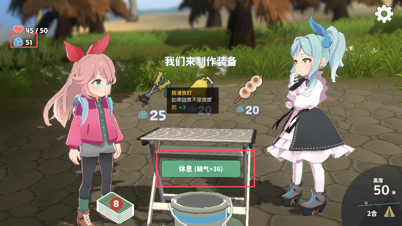5、等到休息,玩家可以使用石头来制作各种装备,随后就可以点击“休息”以恢复朝气了。
