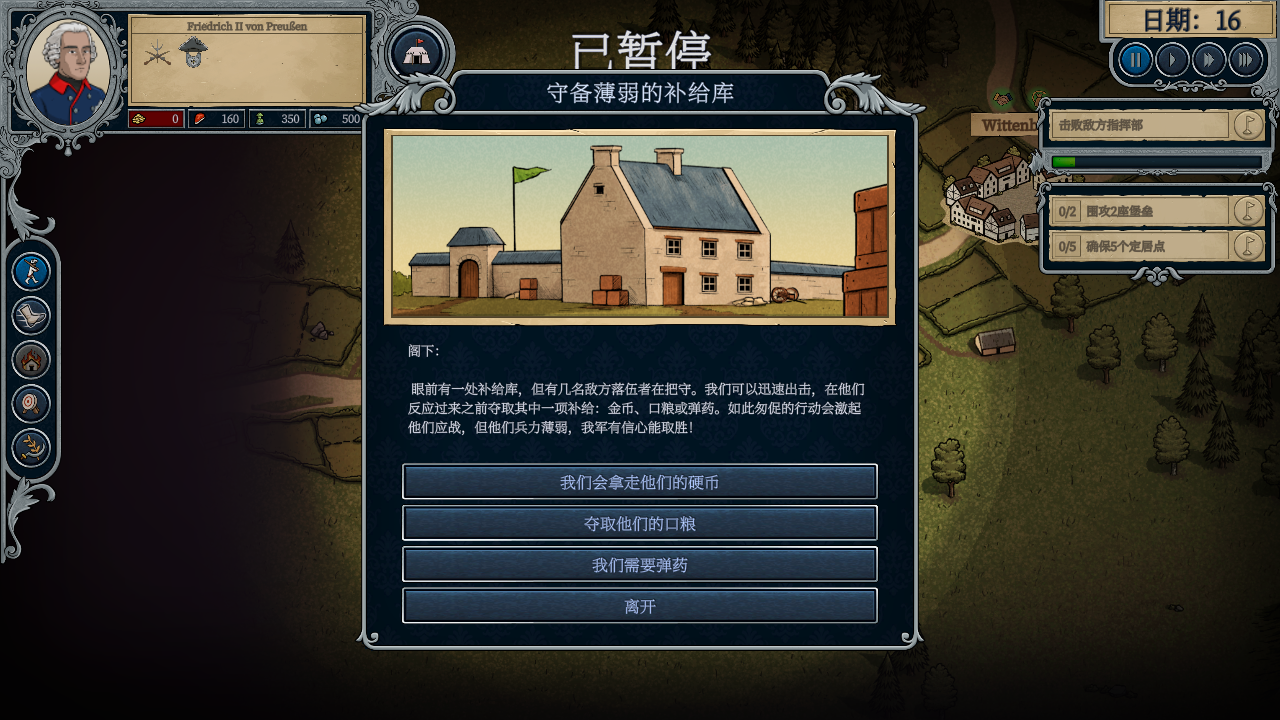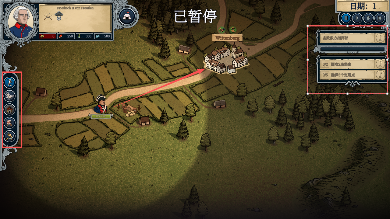 5、这就进入了战略地图,可以通过屏幕左侧的一系列行动来实现行军,强行军,搜寻食物等等操作,在屏幕右侧可以看到此次战略的主要目标,注意屏幕右上角的时间流动机制。