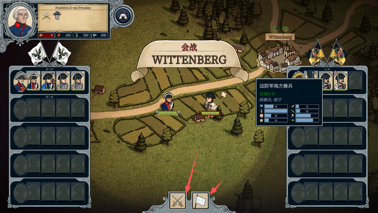 8、屏幕两侧可以看到双方的军队的详细情况,玩家可以在屏幕下方自由选择开战还是撤离,撤离会强行减少资源以及损失部分兵力。