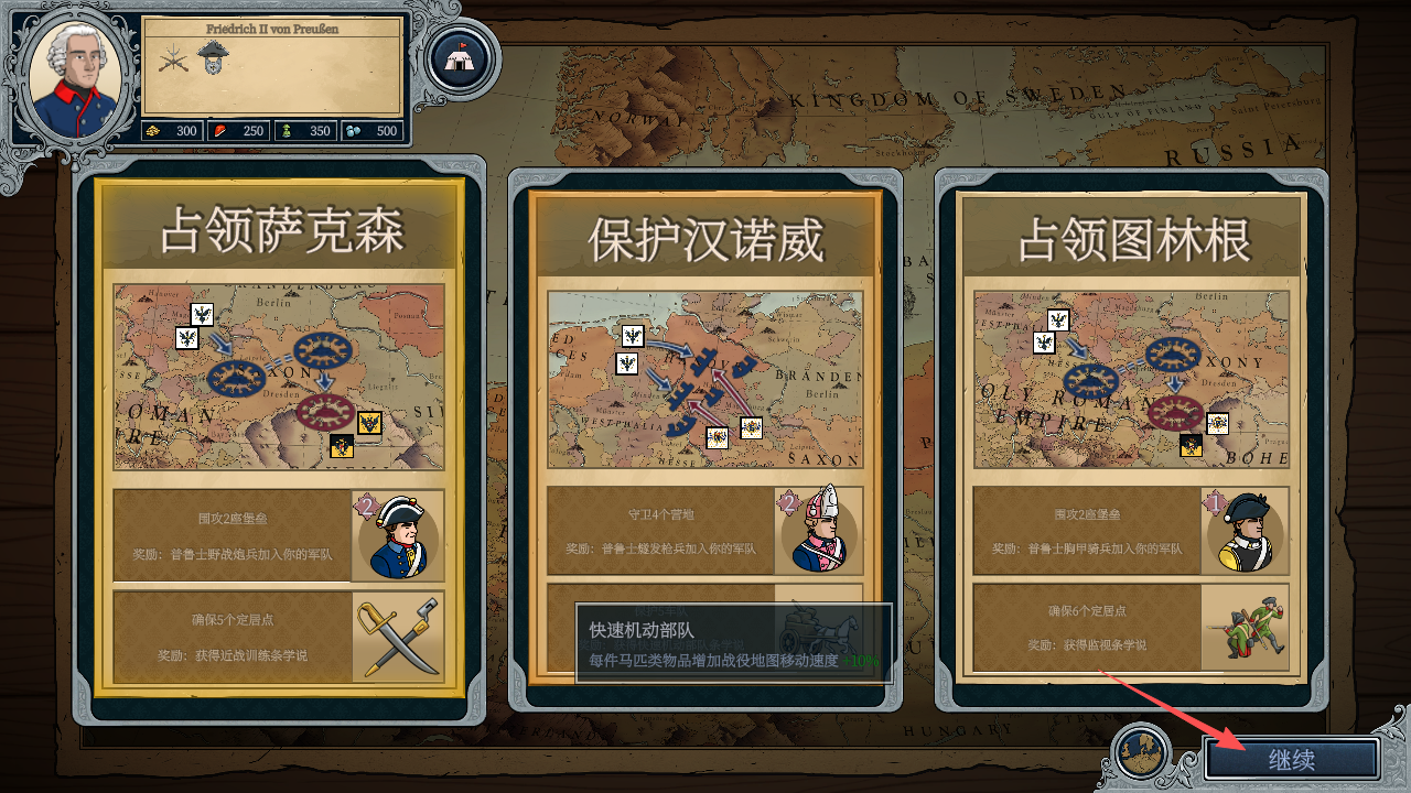 3、游戏开始后会遇到大战略上的一些支线选择,可以看到这些任务的目标以及敌人实力,还有可以获得奖励,选择后,点击屏幕右下角的“继续”。