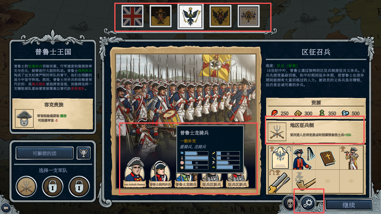 1、进入指挥大师游戏选择国家,屏幕下方可以看见每个国家的特色兵种,在屏幕右边可以看到每个国家的特性buff,点击屏幕右下角的“齿轮”标识。