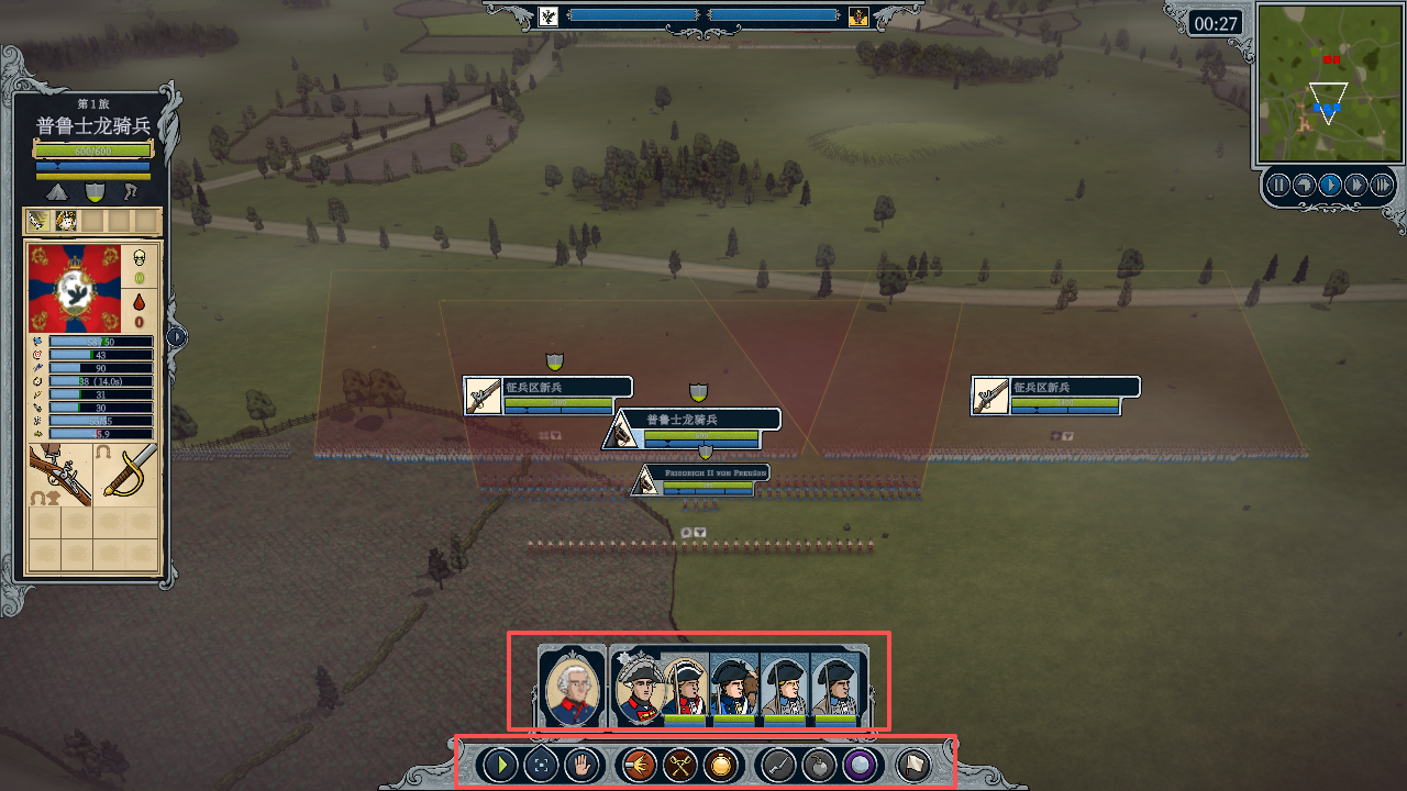 10、在屏幕右上角可以看到上方敌我分布,玩家可以通过直接点击地图上的军队来下达命令,也可以点击屏幕下方的“兵牌”开选择。屏幕最下方的就是军队的一系列“命令”,不妨来试试是否可以“谈笑间樯橹灰飞烟灭”。