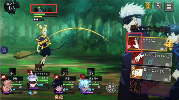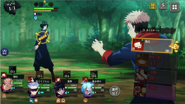 游戏中的战斗十分简单,每个角色有四个技能,除了普攻与最后的终结技外的技能释放需要消耗蓝色能量的咒力,每回合都会回复10点咒力。需要大家通过交替使用普攻和技能来积攒紫色能量的必杀槽,最后消耗全部必杀槽来释放必杀技。