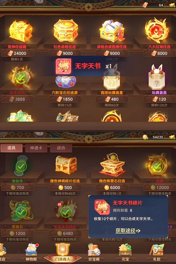 需要1800碎片或15本无字天书,碎片靠组织捐献和日夜巡游,天书靠门派商店买碎片和送花。至少技能6极连携6级(166)再上。