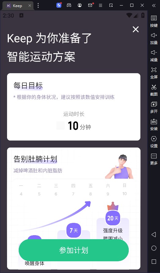 Keep电脑版是需要借助模拟器在电脑上运行的一款运动健身软件。用户使用软件可以自由定制自己的运动目标,一键生成训练计划,轻松记录每一次运动时刻,让每一个努力的瞬间都留下痕迹,尽情享受到运动带来的快乐与健康。