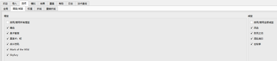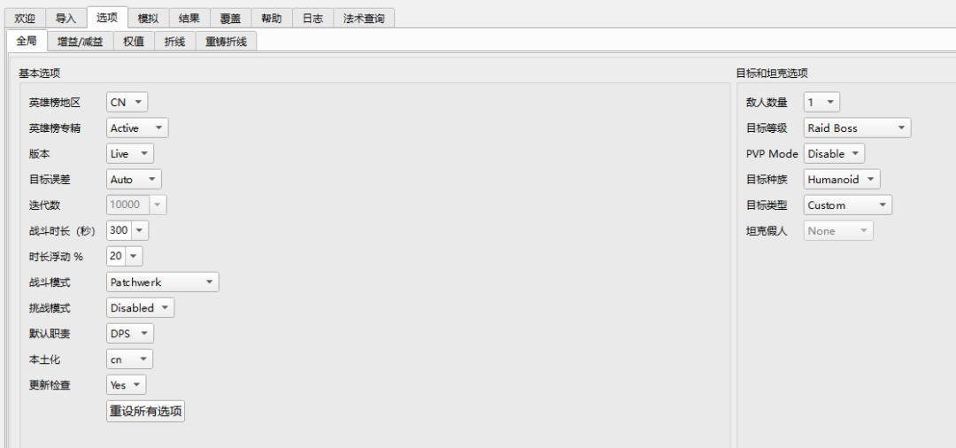 在选项界面玩家可以调整自身BUFF状态,敌人是BOSS还是小怪,以及敌人数量等诸多变量及参数,保证模拟的准确性,当然由于汉化工作没有完成目前大部分界面还是英文。
