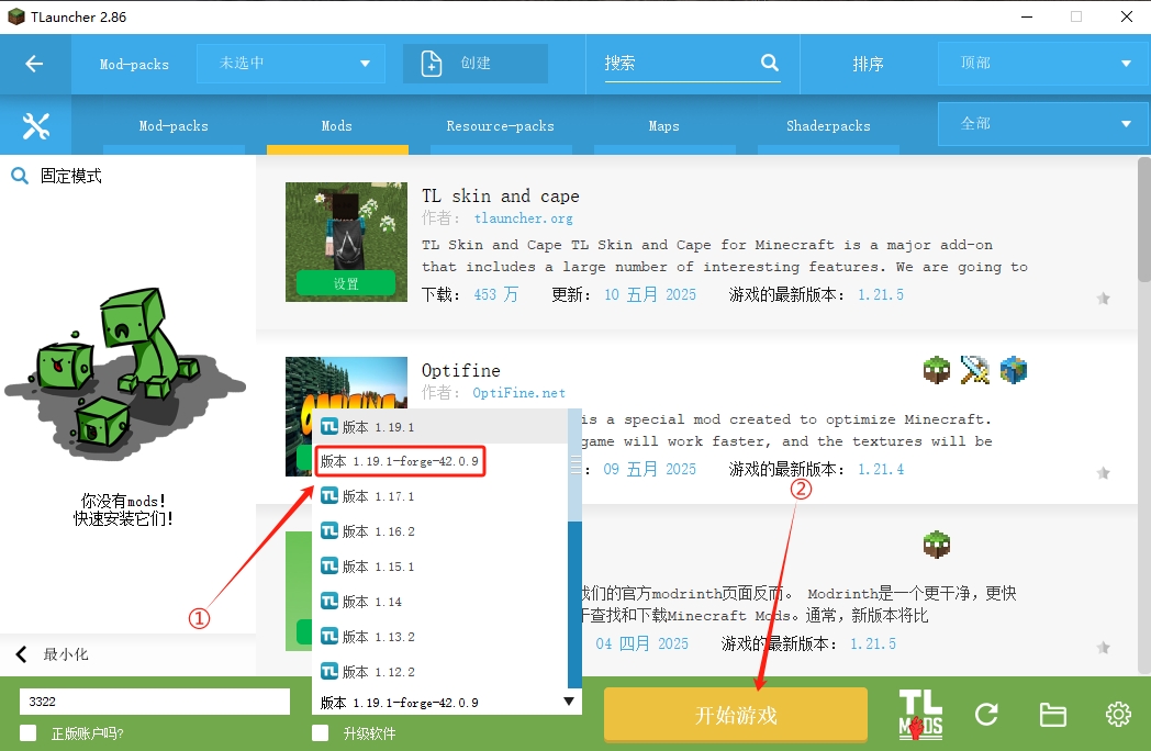 2、在游戏启动器中选择带有“Forge”标识的版本,启动游戏后进入主界面,点击“Mods”按钮查看已加载的Mod列表。