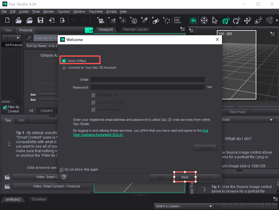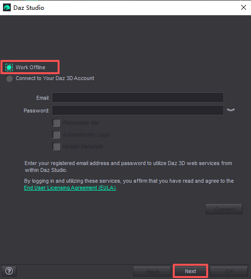 8、随后在软件内找到【Help】功能,点击【Register Daz Studio】后,选择【Work Offline】,随后点击Next;