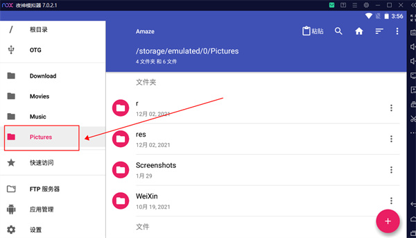 2、在左侧目录向下滑动,找到“Pictures”文件并点击进入