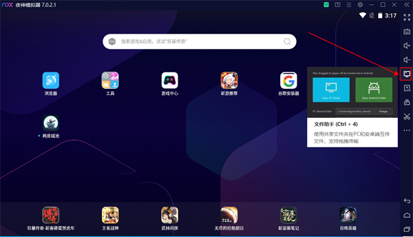 1、启动夜神模拟器,点击右侧工具栏“文件助手”工具