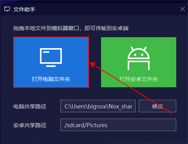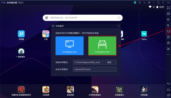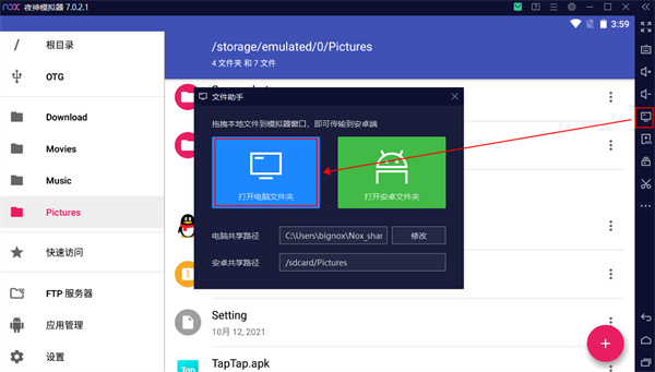4、粘贴完成后,点击模拟器右侧工具栏“文件助手”,选择“打开电脑文件夹”