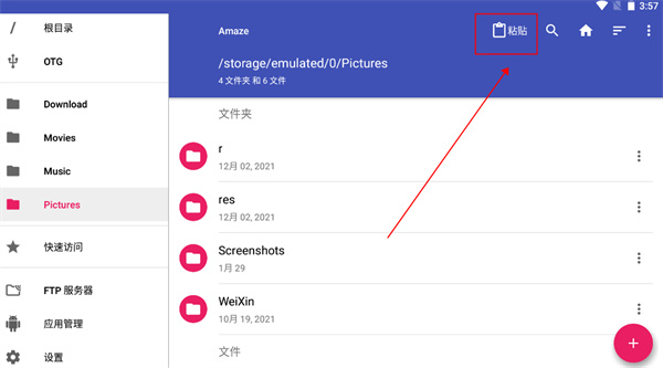 3、点击右上方“粘贴”按钮,将文件粘贴至此文件夹