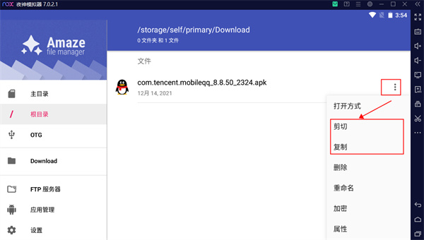1、在模拟器文件管理器中找到想传至电脑的文件后,点击文件右方的“三点”按钮,选择 剪切/复制(根据自身需求)