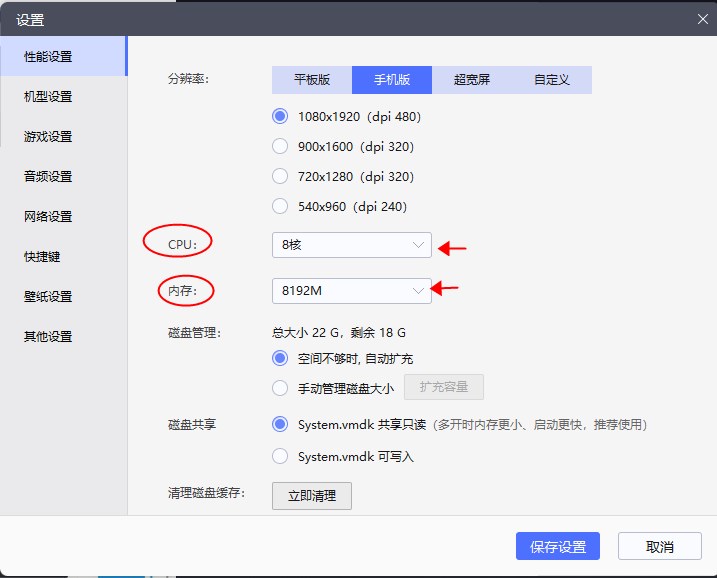 2、在性能设置中降低分辨率,然后把CPU和内存都设置为“推荐”的选项。
