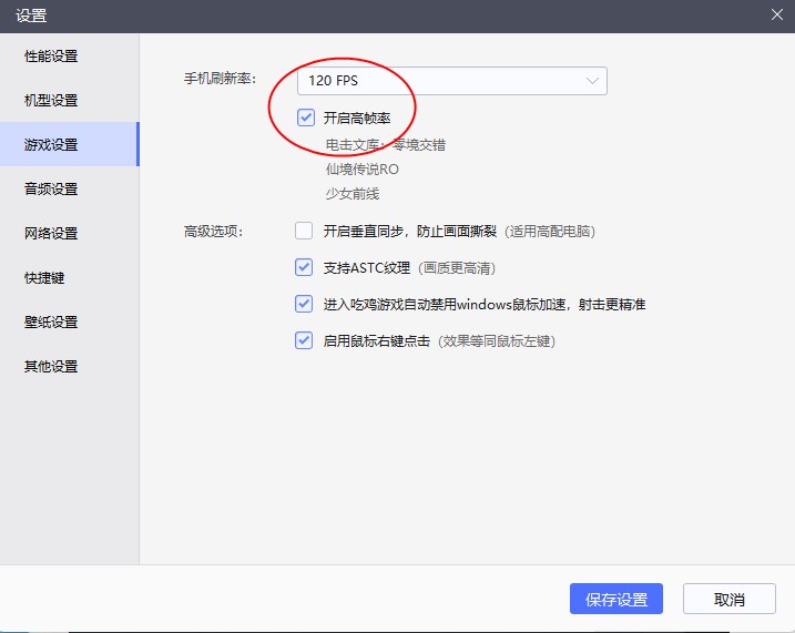 3、接着进入“游戏设置”,如果我们的配置不足,尽量调低游戏帧速率,一般设置“60FPS”就可以很流畅了。