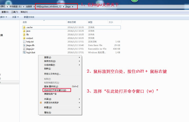 1、打开命令行窗口,并找到360加固助手当前目录。在jiagu文件夹下按住shift键,右键菜单选择“在此处打开命令窗口(W)”即可调出命令窗口(也可在开始菜单运行cmd)(见下图):