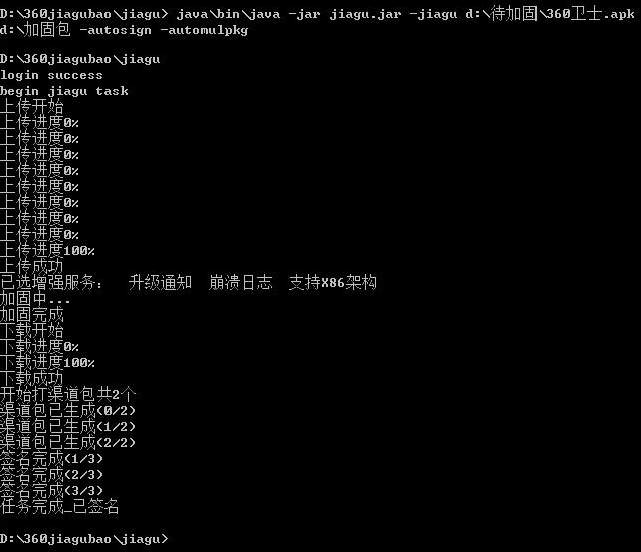 7、加固应用“java\bin\java -jar jiagu.jar -jiagu<inputAPKpath><outputpath> -autosign -automulpkg”