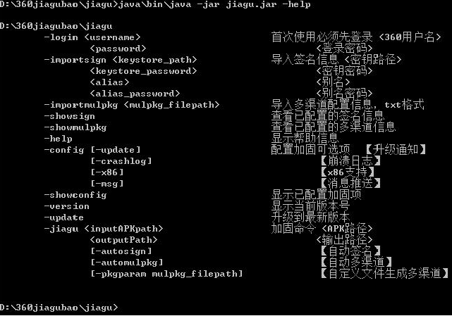 360加固助手支持命令行方式,即在命令行输入相关命令可执行加固应用、导入签名信息、导入多渠道配置信息等操作。