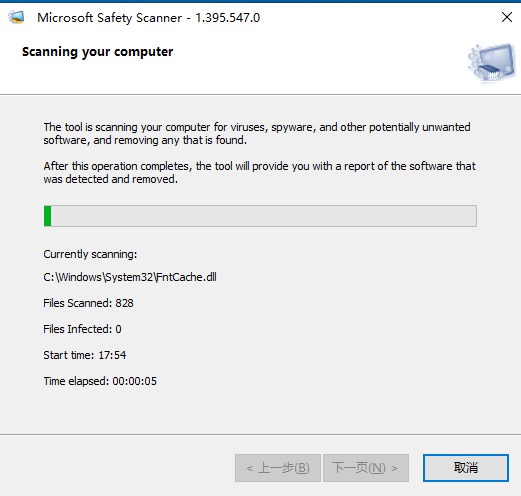 在扫描过程中,Microsoft Safety Scanner 会显示它当前正在分析的文件,并显示有关扫描文件数量和检测到的感染数量的统计信息。会显示开始时间和经过的时间,最后会生成有关调查结果的报告。在此过程中,计算机的压力适中,因此您可以同时进行工作。