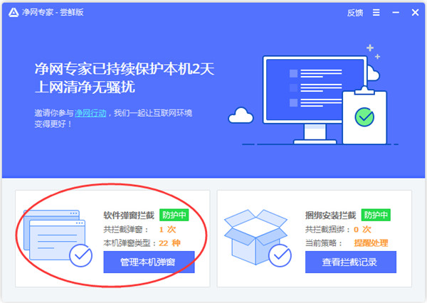 1. 打开净网专家的主界面,点击捆绑软件“查看拦截”按钮。
