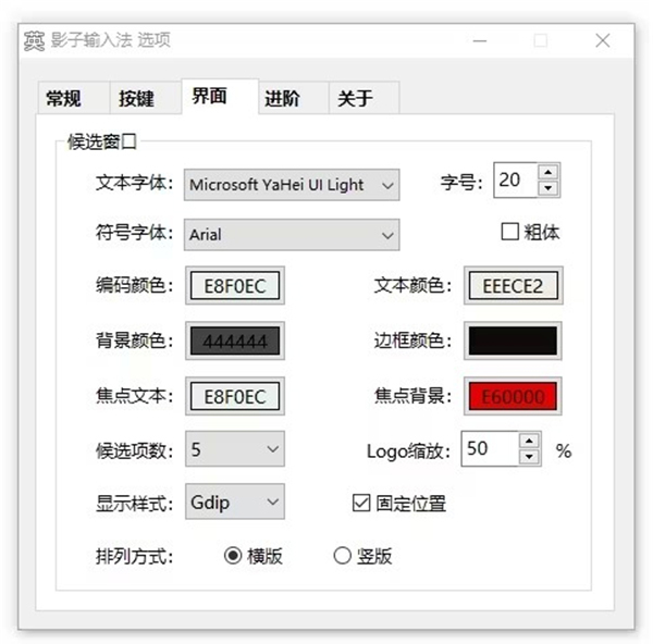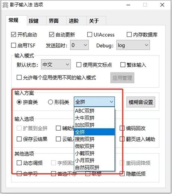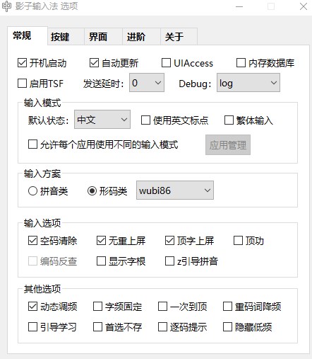 14、输入方案:分为拼音、形码两大类。拼音及双拼都归为拼音类,使用pinyin词库;所有最大码长为4位的都归为形码类,包括五笔、小鹤音形等,使用的词库由导入的文件名决定,在导入后重新打开选项选择相关选项。