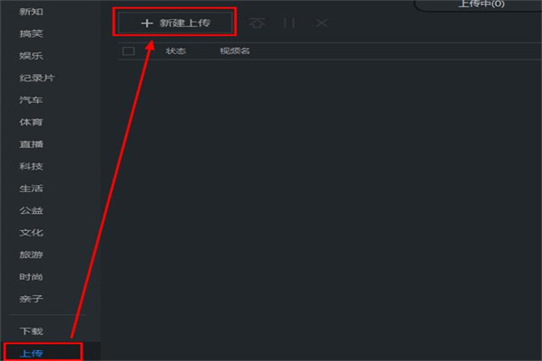 1、打开在本站下载站好的优酷视频客户端后,打开软件后点击左侧的【上传】选项,然后在选择【新建上传】。