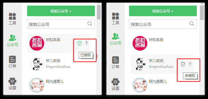 (2)鼠标移入公众号,右边会显示授权状态,并有文字提示。授权为绿色图标,未授权为灰色图标;