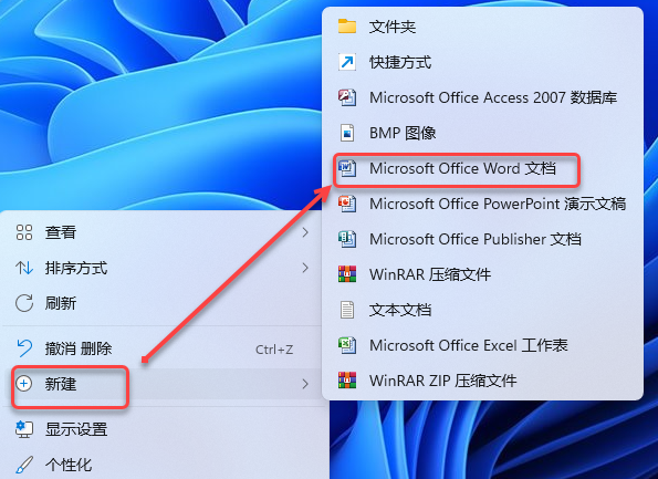 10、在桌面空白处,鼠标右击选择【新建】选择【Microsoft Word 文档】。