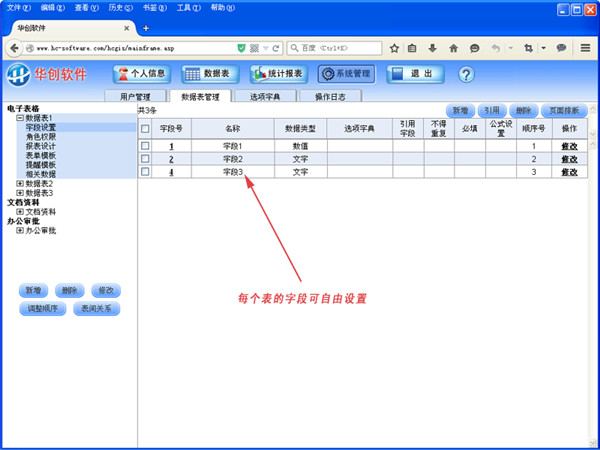 自由设置字段:每个表的字段可自由设置,支持以下字段类型:数值型、文字型、文字段型、日期型、日期时间、下拉框、勾选框、附件、超链、自动编号。其中,附件型字段可用于上传 Excel、Word、图片等文件。