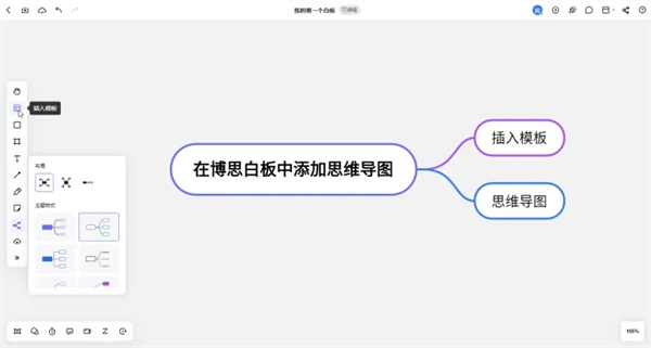 博思白板支持直接插入思维导图,目前有两种添加导图的方法,一个是点击左侧工具栏第 2 个按钮「插入模板」,从博思白板提供的众多模板中插入导图模板,在模板的基础上进行修改;一个是点击工具栏倒数第 3 个按钮「思维导图」,从 0 开始创建导图。