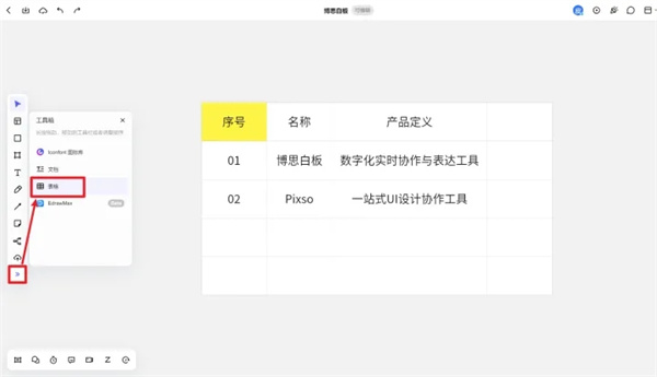 在使用博思白板的过程中,如果你也需要用到表格来呈现数据,可以点击左侧工具栏最下方的「工具箱」,在打开的菜单中选择「表格」。