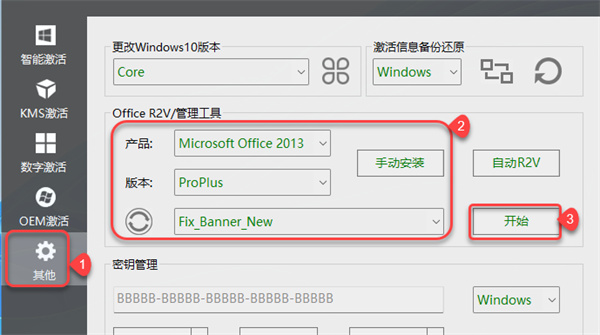14、①点击【其它】②选择产品【Microsoft Office 2013】;选择版本选择【ProPlus】;选择类型【Fix_Banner_New】③点击【开始】。