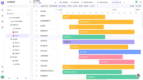 甘特视图:以横向的时间轴来展示任务先后顺序、持续时间的视图,能帮助你全局掌控项目。