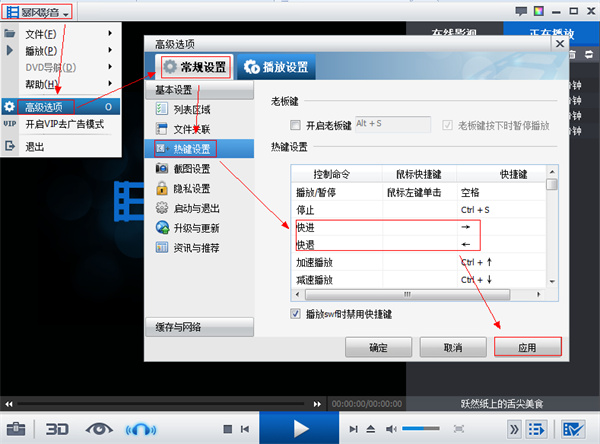 目前暴风暂时只支持本地视频和在线暴高清视频的快进/快退。暴风5的默认快进快退的快捷键为【快进 →】和【快退 ←】,可以使播放快进5秒或快退5秒。您可以进入高级选项——常规设置——热键设置中设置快捷方式。