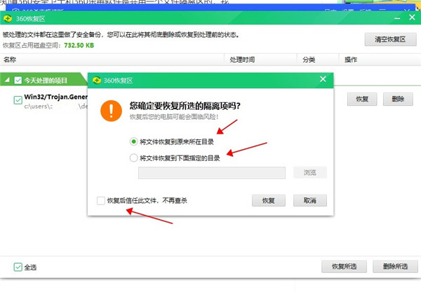 4、这就可以选择恢复文件到指定文件夹或者是恢复到原来的目录中了,但是注意一定要勾选恢复后信任,不再查杀,然后下次再次扫描又会再次被杀毒隔离的。