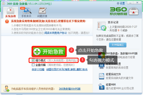 1、大家可以通过官网下载急救箱,使用杀毒功能勾选强力模式开始急救,扫描完成重启电脑再次勾选强力模式急救,扫描完成重启电脑。