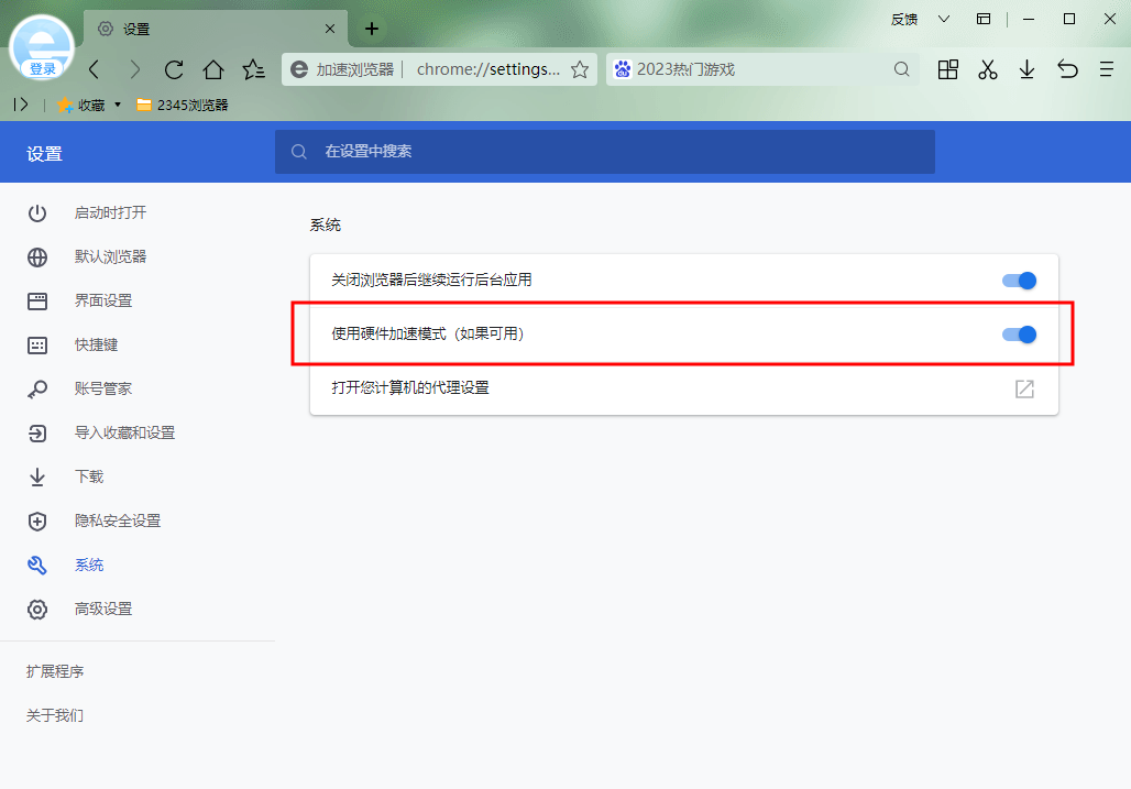 2、打开浏览器设置页,左侧选择“系统”,找到“使用硬件加速模式”功能并取消勾选。
