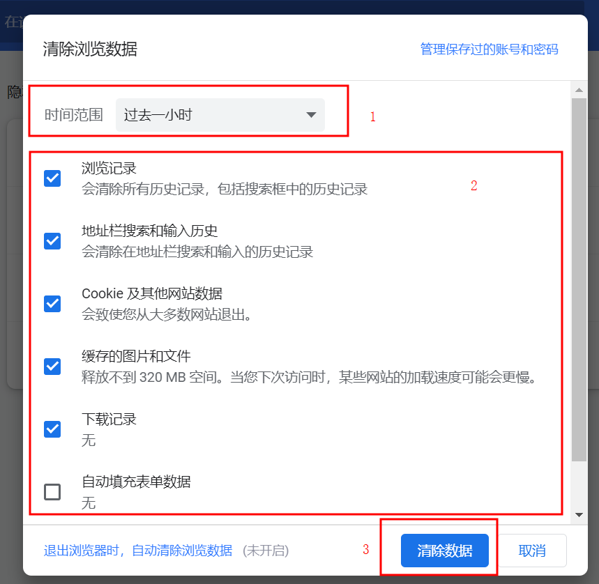 (1)点击清除面板左下角的文字提示“退出浏览器时,自动清除浏览数据”。