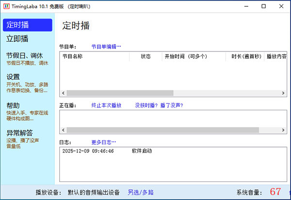 通过电脑软件实现音乐定时播放,并将电脑音频输出接在扩音机上,此方案具备简单灵活、成本较低的优点。虽然高档化的广播系统(硬件)本身就支持音乐定时播放,但高档设备往往有购置昂贵、操作复杂、维护成本高的缺点。