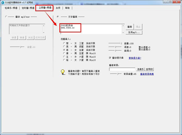 518超市播音软件是一款强大的智能广播程序,可用于超市/商城/学校晚间音乐、超市/商城促销播报、超市/商城打烊音乐、学校上下课铃声等方面。程序汇集大量优质的中英文语音库,发音清晰接近真人播音,包括背景音乐、定时广播、即时插播三个播放模式,可设定开始时间、播放内容、播放次数、周几或几号播放以及节目有效期等内容,高优先级频道播音时低优先级频道自动降低音量,频道切换时带有淡入淡出效果,同时可通过将电脑音频输出连接至功放,即可打造一套超市播音系统。518超市播音软件具有独特的“文字播音”功能,该功能可将用户输入的文字直接生成为Mp3并用于播放,在播放的过程中用户可自选播放的声音、音量、语速和音调等内容。