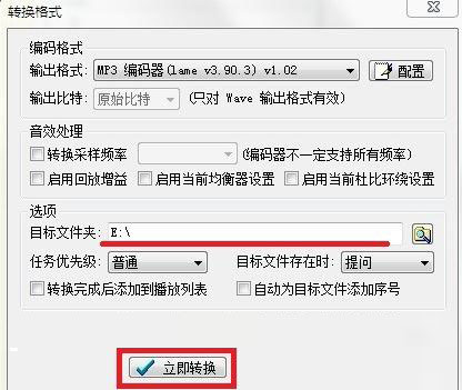 3、选择指定目标文件夹存储歌曲。点击立即转换;转换前可以根据需要选择“转换完成后添加到播放列表”和“自动为目标文件添加序号”。