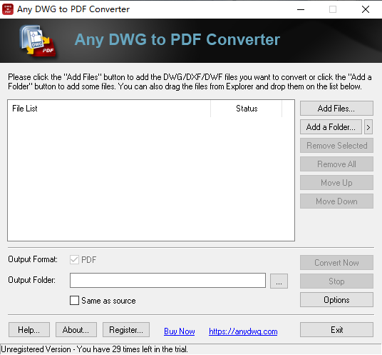 1、运行任何DWG到PDF的转换器。单击“添加文件”按钮添加您想要转换的DWG/DXF/DWF文件,或者单击“添加文件夹”按钮添加一些文件。您也可以简单地将文件从Windows资源管理器拖到转换器窗口中。